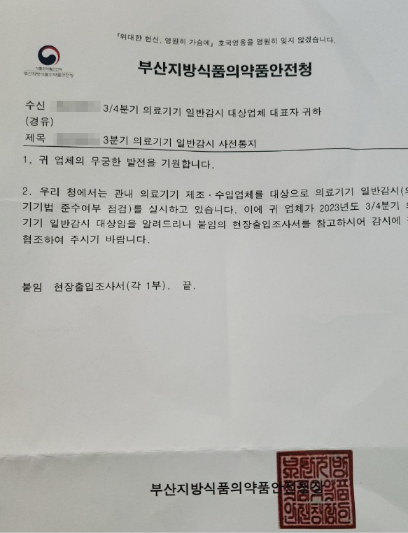 일반감시 공문은 대개 우편으로 발송되며 담당자와의 전화 통화를 통해 일정이 조율됩니다. 점검 당일에는 관할 지방식약청 주무관이 약 2인 정도 방문하여 대략 2시간에서 4시간 정도 현장 조사를 수행합니다. 조사 범위는 시설과 문서 두 가지 분야로 나누어지며, 이 중에서 가장 중요하게 평가되는 부분은 문서 관리의 적정성입니다.