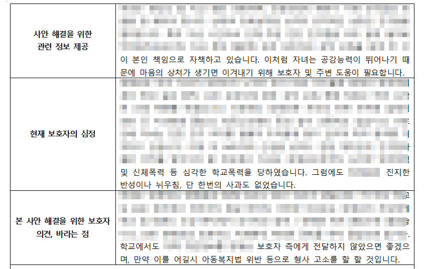 또한 자녀의 특이사항이나 가정환경 중 이번 사건과 관련될 수 있는 부분이 있다면 함께 기재하셔야 합니다. 예컨대 자녀가 특정 질환이나 장애로 인해 스트레스에 예민한 경우, 학교 측이 이를 고려하여 적절한 대응을 할 수 있도록 참고자료로 제시하는 것이 좋습니다.
